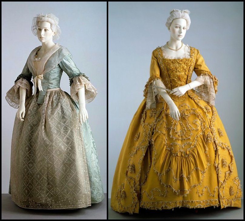 Le satin et le satin sont les tissus les plus populaires. Ces tissus, doux au toucher, permettent les nombreux plis si nécessaires à l'époque rococo, de plus le satin brillant était en parfaite harmonie avec la dentelle mate.