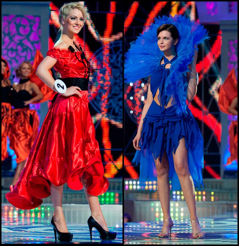 En plus d'apparaître en robes de soirée, les participants au concours montaient également traditionnellement sur scène en maillot de bain, dont certains étaient attachés, pour une raison quelconque, à des ornements faits de ballons ridicules et de costumes nationaux. Des costumes nationaux pour les participantes au concours "Miss Belarus-2012" ont été conçus cette année designer biélorusse Yulia Latushkina et, comme l'ont noté les journalistes, la collection s'est avérée être "château", "princière", et certaines robes ont même eu beaucoup de succès. Les tenues de Yulia Latushkina sont des robes légères de blanc, rouge (la couleur de l'ornement biélorusse, sans les motifs habituels dont ils ont enfin pu faire cette fois), noir et or. Sur les robes - manteaux de fourrure blancs ou vestes sans manches en fourrure. "En général, dans les robes de Yulia, chacune des candidates pouvait certainement se sentir comme une vraie princesse" - je voulais déjà écrire en regardant plusieurs images réussies, mais j'ai ensuite vu le reste, eh bien, toutes les filles n'ont pas eu de la chance . ..