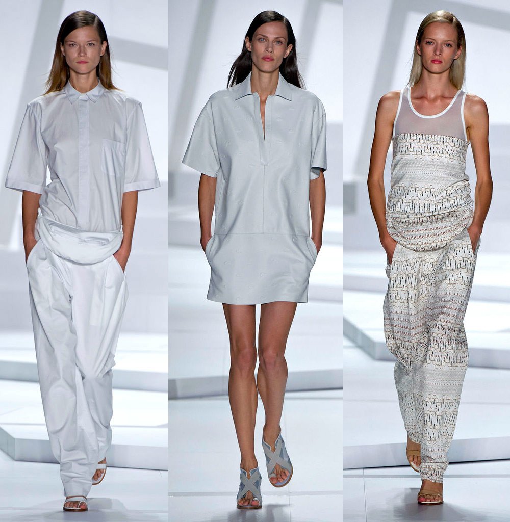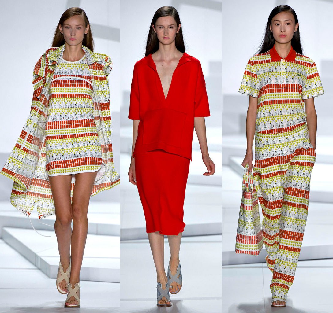 En général, la collection Lacoste contient beaucoup de robes courtes et de pantalons. La collection est tout à fait portable. Les téléspectateurs de l'émission se souvenaient cependant sans aucun doute de la robe à manches courtes et larges, sur laquelle les emblématiques polos Lacoste étaient disposés en rangées régulières, alors qu'ils étaient pliés comme sur une étagère dans un magasin - un dispositif très ironique.