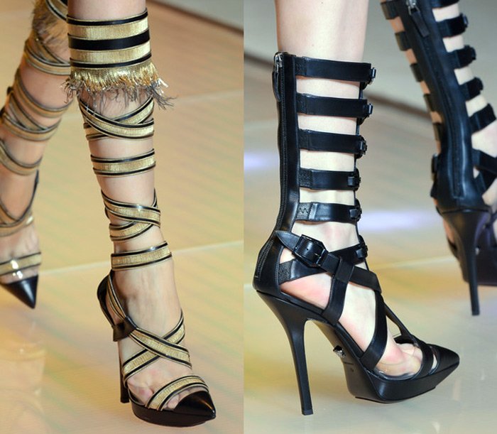 Par exemple, sandales gladiateur ou des modèles avec laçage autour de la jambe, ou des tissages ajourés jusqu'au genou.
